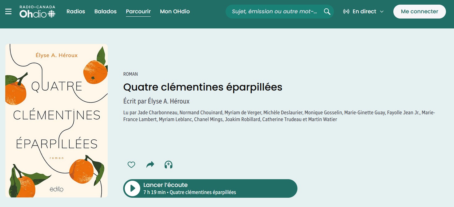 Retrouvez la version audio du roman d’Élyse A. Héroux, Quatre clémentines éparpillées, sur le site d’ici.radio-canada !
