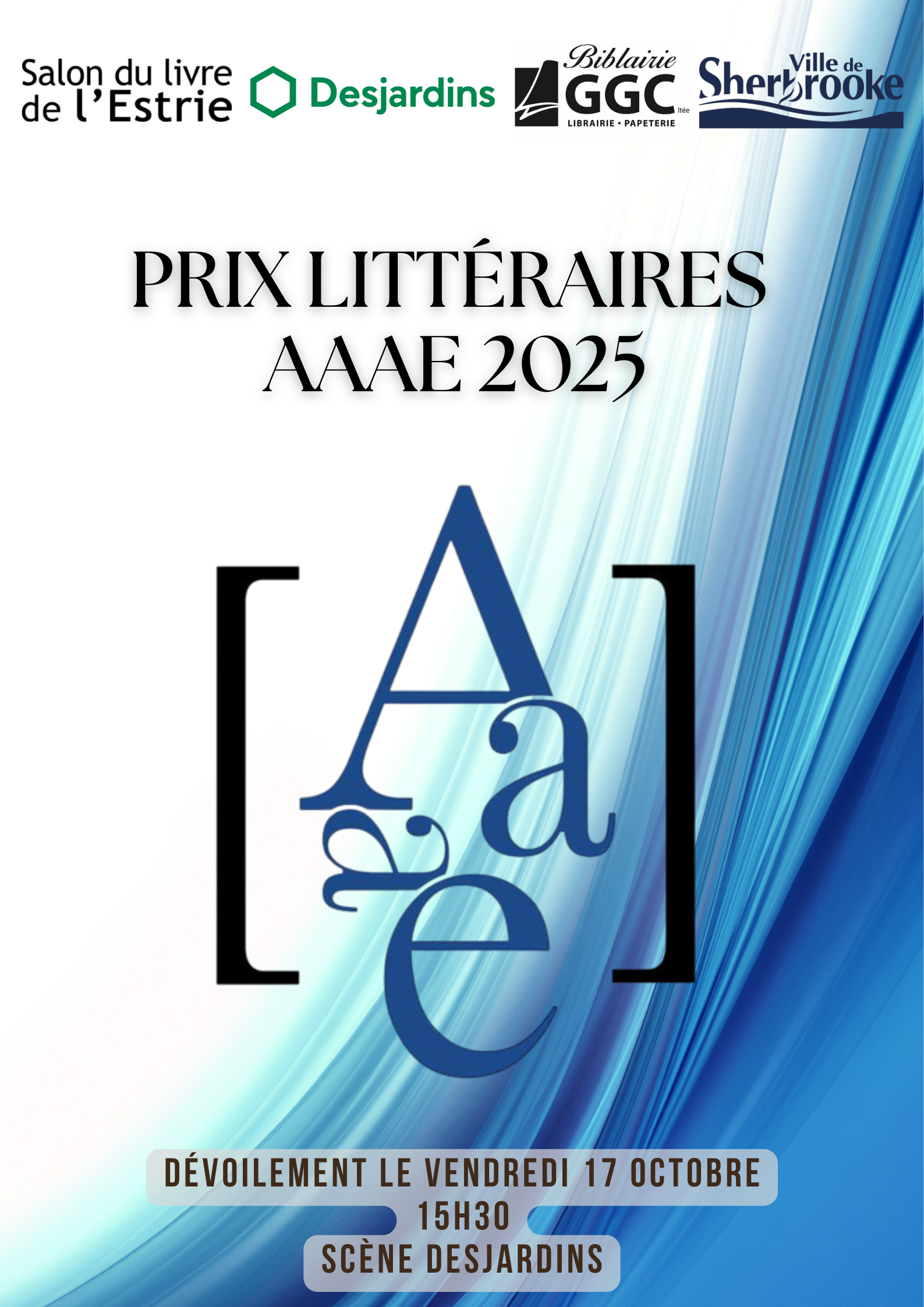 Le vendredi 17 toujours, à partir de 15h30, l’AAAE remettra ses prix littéraires lors d’une cérémonie animée par Christiane Lahaie. Desrochers, Desjardins, Pouliot-Sirois et Littérature grand public… Qui seront les lauréats ? Découvrez-le en même temps que tous les finalistes !
