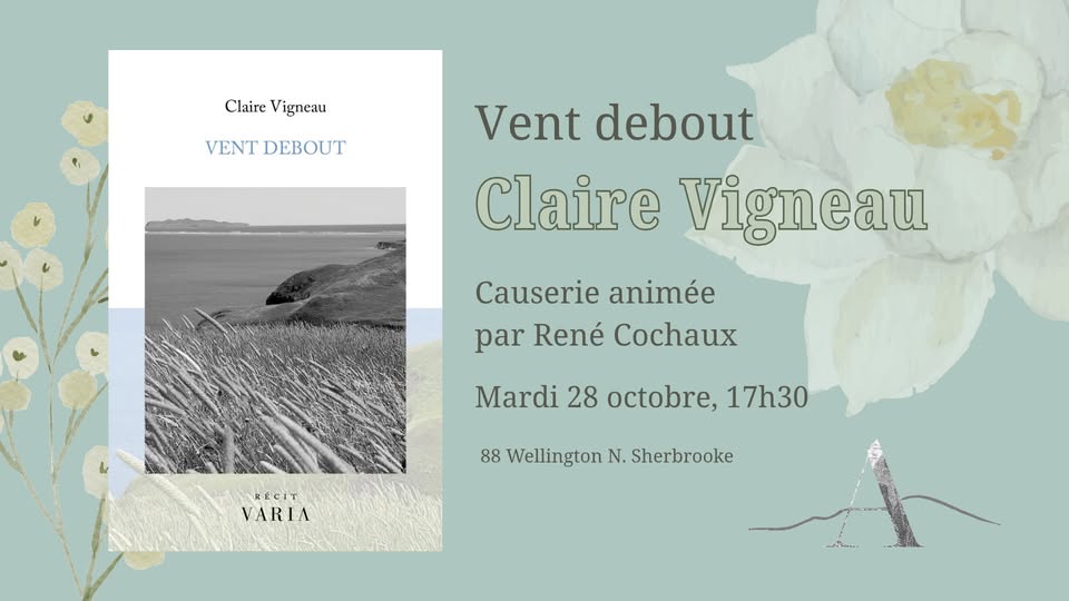 Claire Vigneau, René Cochaux et la librairie Appalaches vous invitent à une causerie autour de Vent debout, édité dans la Collection Varia de Nota Bene. Une occasion toujours précieuse pour rencontrer une auteure d’ici.