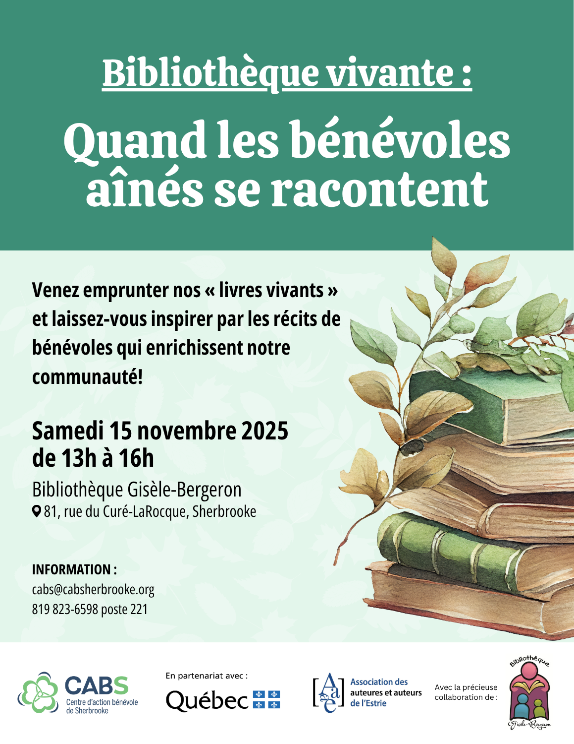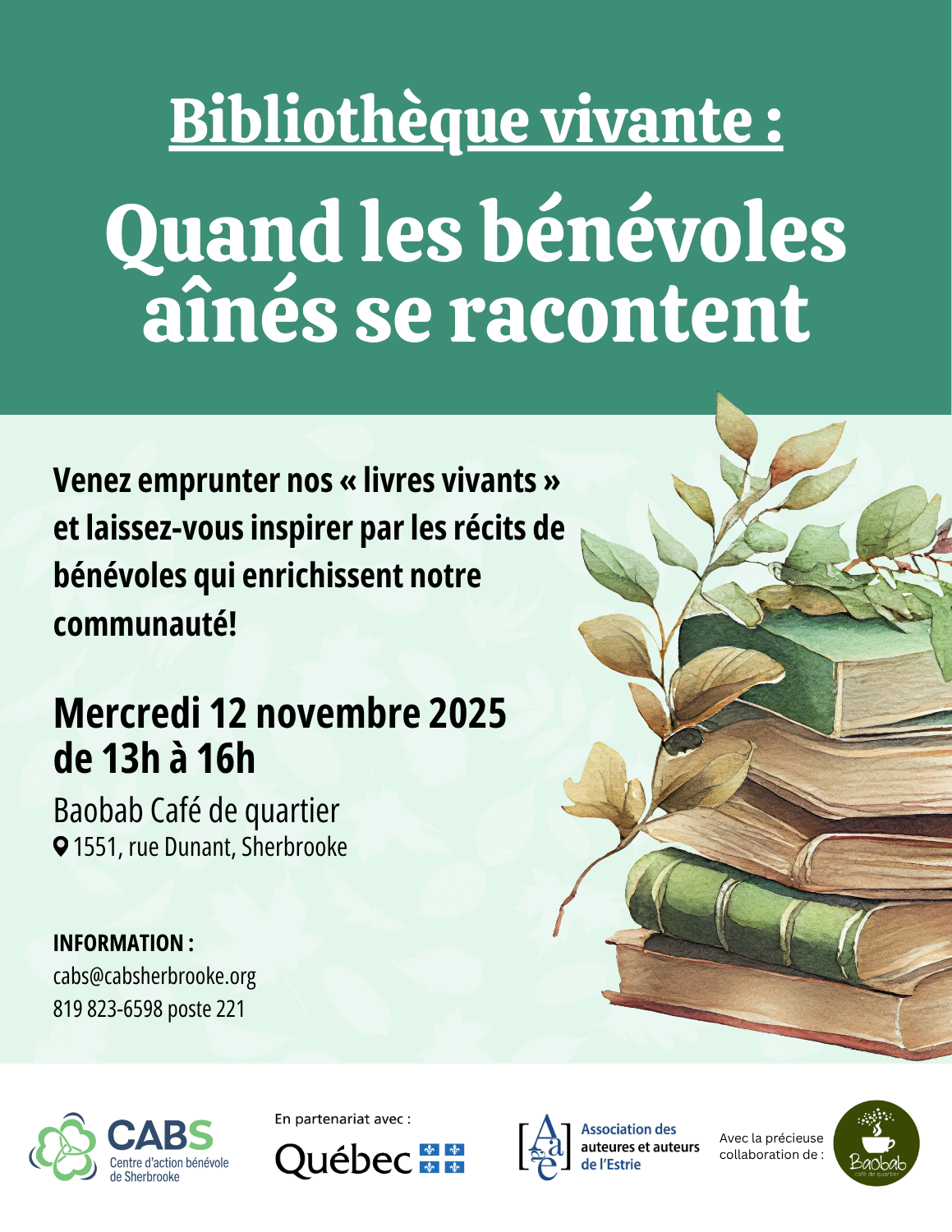 L’AAAE est fière d’être le partenaire du Centre Action Bénévole de Sherbrooke dans le cadre du projet de Bibliothèque vivante : quand les ainés se racontent.