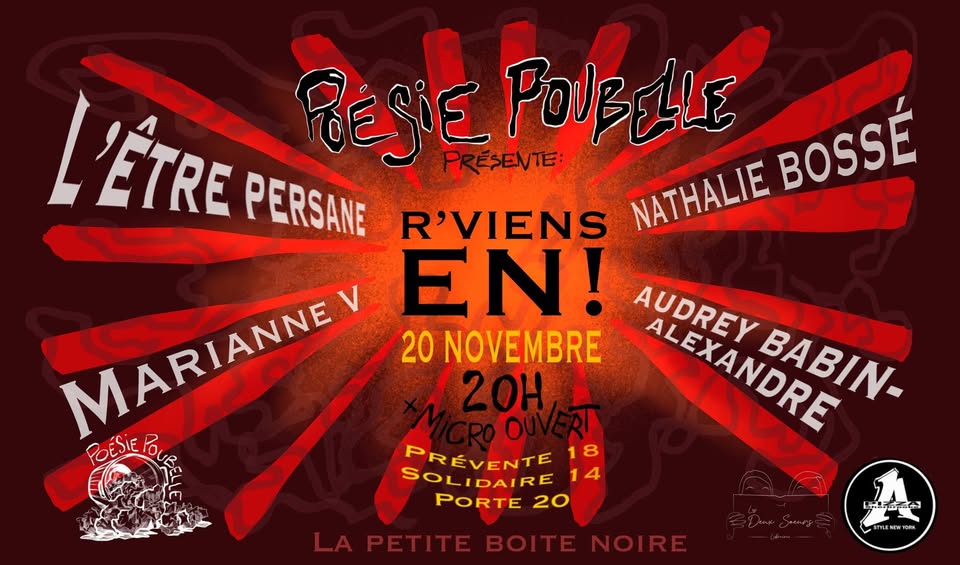 « Poésie poubelle, c’est la soirée de poésie la plus punk, la plus éclatée et en même temps la plus accueillante en ville. Avec le thème « R’viens-en », l’animateur Félix Dion revire encore tout pour mettre le feu aux mots! Je partagerai la scène en première partie avec des artistes de la parole que j’adore et que tu ne veux absolument pas rater : Audrey Babin-Alexandre, L’Être Persane et Nathalie Bossé. En plus, il y a le fameux micro-ouvert en deuxième partie : apporte ton texte et viens nous garrocher ça dans la face… ou nous le chuchoter dans le micro, tout est possible à Poésie poubelle! »