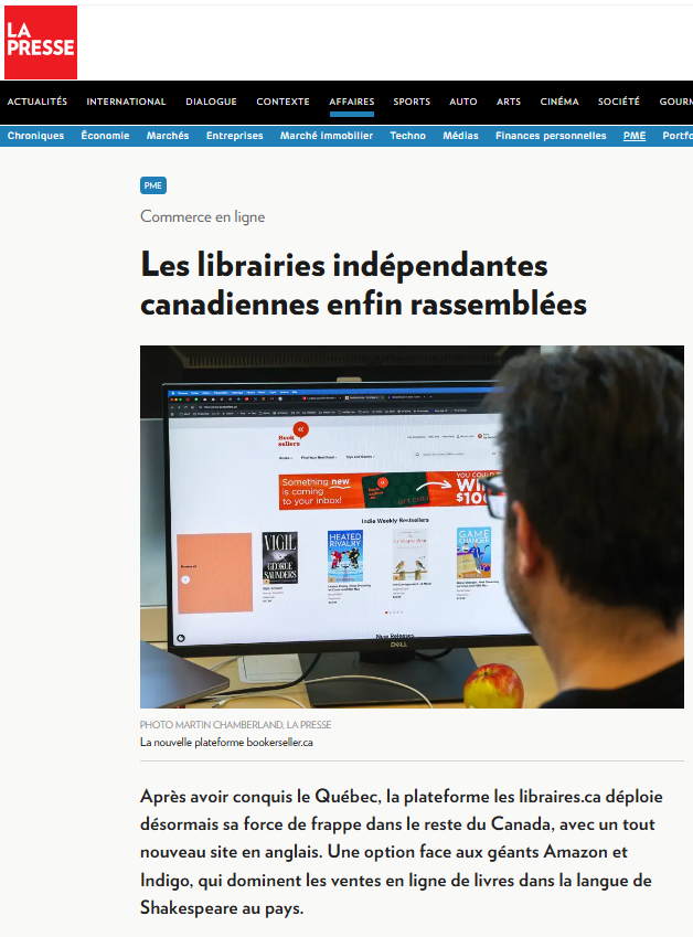 « Après avoir conquis le Québec, la plateforme les libraires.ca déploie désormais sa force de frappe dans le reste du Canada, avec un tout nouveau site en anglais. Une option face aux géants Amazon et Indigo, qui dominent les ventes en ligne de livres dans la langue de Shakespeare au pays.