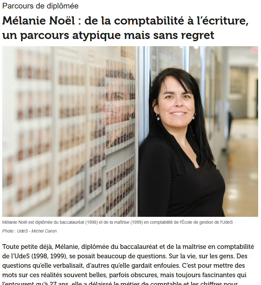 « Toute petite déjà, Mélanie, diplômée du baccalauréat et de la maîtrise en comptabilité de l’UdeS (1998, 1999), se posait beaucoup de questions. Sur la vie, sur les gens. Des questions qu’elle verbalisait, d’autres qu’elle gardait enfouies. C’est pour mettre des mots sur ces réalités souvent belles, parfois obscures, mais toujours fascinantes qui l’entourent qu’à 27 ans, elle a délaissé le métier de comptable et les chiffres pour prendre la plume et écrire. Pour raconter des histoires, celles des autres, celles de sa région, celles que l’on aurait enterrées si elle ne les avait portées au grand jour. Son livre à paraître sous peu, La mort des autres, tente d’apprivoiser une réalité qui la hantait particulièrement : la finitude de toute chose, à commencer par celle de chaque être humain. En un mot : la mort. »
