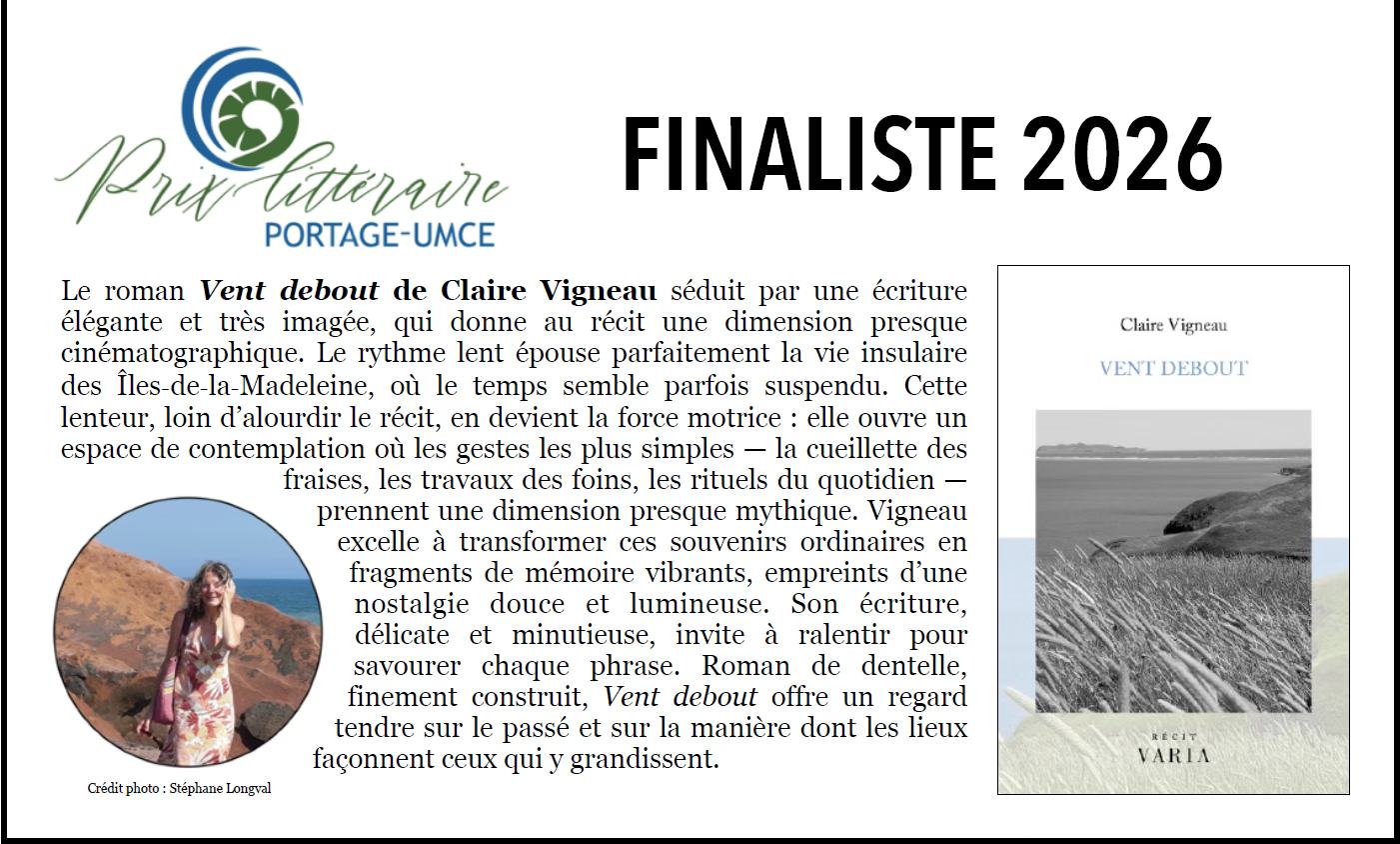 Nous tenons à féliciter Claire Vigneau qui voit son dernier ouvrage, Vent debout, décrocher une place de finaliste au Prix littéraire Portage-UMCE !