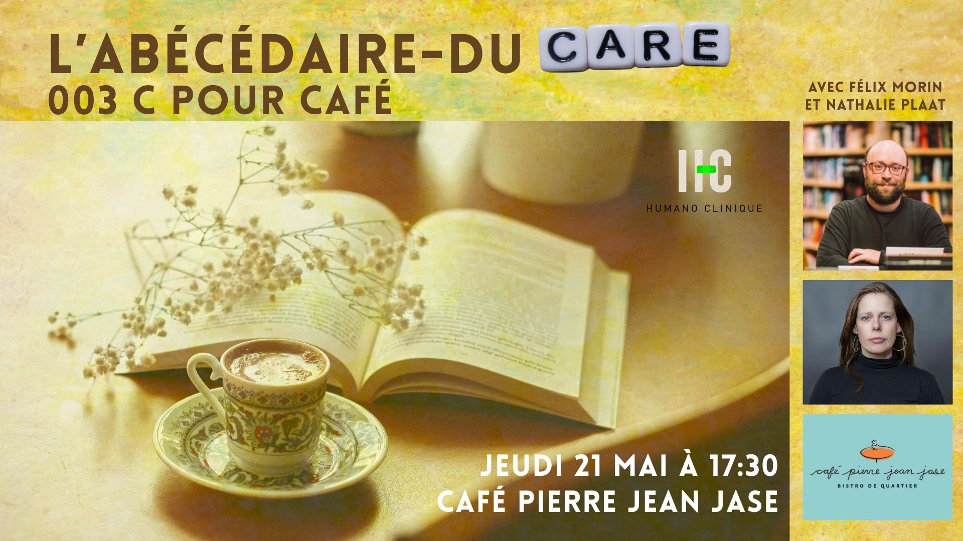Parce que les mots nous soignent et nous aident à vivre, chaque mois, Félix Morin et Nathalie Plaat avancent ensemble dans un alphabet constitué de ces mots qui nous rendent la vie habitable. Une sélection d’ouvrages est mise à l’honneur autour du mot du mois, afin de garnir nos trousses de survie pour les jours toffs, dans un échange décontracté où le public est aussi convié à partager son propre Abécédaire-du-care.