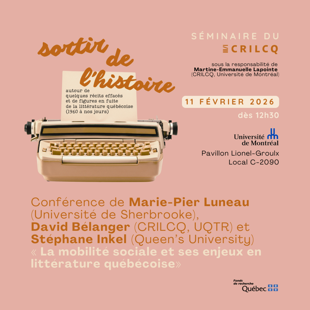 L’activité s’inscrit dans le cadre du Séminaire du CRILCQ « Sortir de l’histoire : autour de quelques récits effacés et de figures en fuite de la littérature québécoise (1960 à nos jours) », sous la responsabilité de Martine-Emmanuelle Lapointe (U. de Montréal).